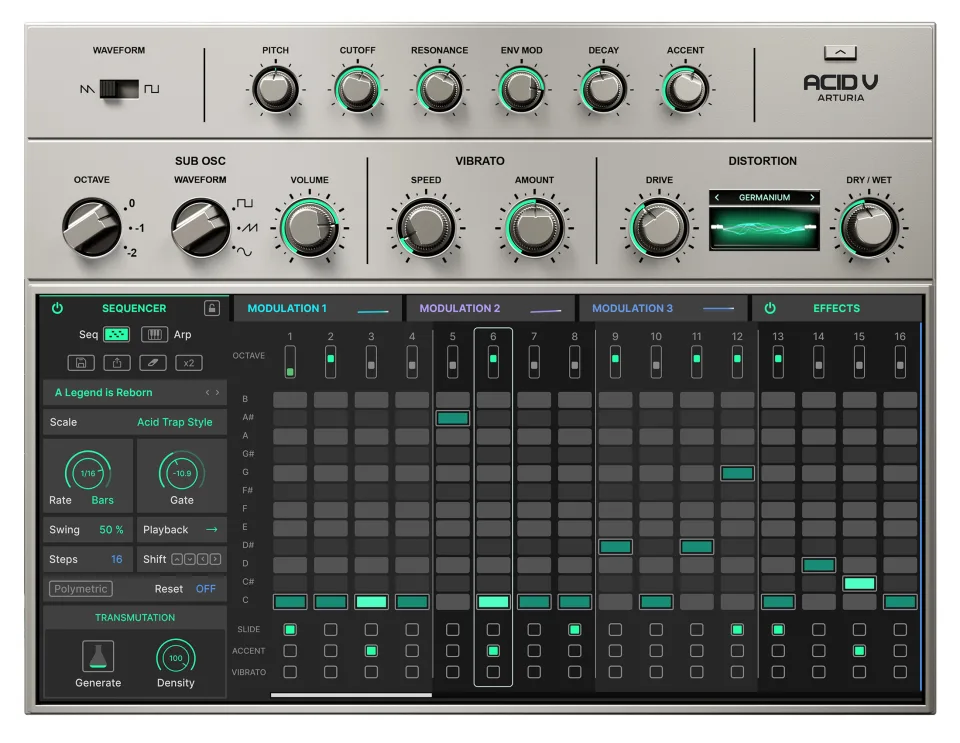 아르투리아 애시드 V는 아마도 최근 몇 년간 아르투리아가 만든 악기 중 가장 단순한 악기 중 하나일 것입니다. 부분적으로는 오리지널 303이 상당히 단순한 악기이기 때문입니다. 단일 오실레이터, 24db 저역 통과 필터, 필터를 조작할 수 있는 엔벨로프 제너레이터를 갖춘 모노 포닉 베이스 머신입니다. 그게 다입니다. 이 악기를 특별하게 만든 것은 시퀀서의 슬라이드와 결합했을 때 완전히 독특한 사운드를 만들어 내며 애시드 하우스의 핵심이 된 기묘한 스퀠치 사운드 때문이었고, 그래서 Acid V라는 이름이 붙여졌습니다.